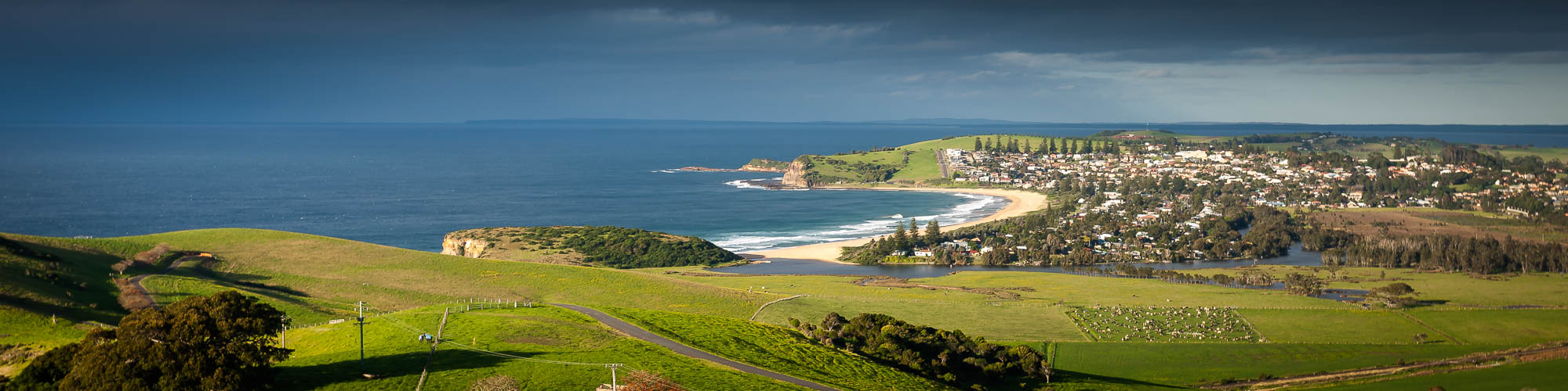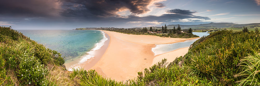 Gerringong is a coastal town that feels instantly refreshing, set between rolling green hills and the deep blue sweep of Werri Beach. The headlands rise gently at either end, giving the whole area a wide-open, spacious feel — perfect for slow walks, early-morning swims, or simply taking in the contrast between farmland and ocean.