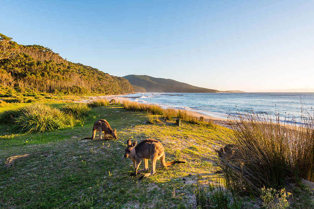 One of the park’s standout features is Pebbly Beach, a beautiful sandy bay flanked by rocky headlands and frequented by eastern grey kangaroos grazing near the shoreline, making it a uniquely iconic spot in this part of the NSW south coast. The views across the ocean and headlands from various vantage points add to the park’s coastal charm.