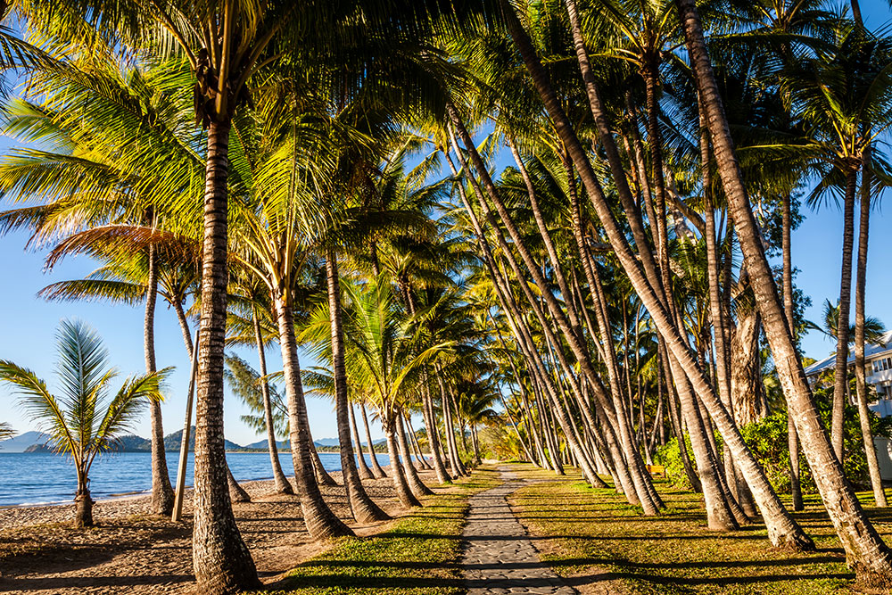 Palm Cove is one of the most picturesque coastal villages in Far North Queensland, known for its elegant charm and tropical atmosphere. The esplanade is lined with ancient melaleuca trees, boutique resorts, and open-air cafés that look straight out to the Coral Sea. The beach itself is long, golden, and calm, with views stretching to Double Island — perfect for an early morning stroll or an evening walk as the light softens over the water.