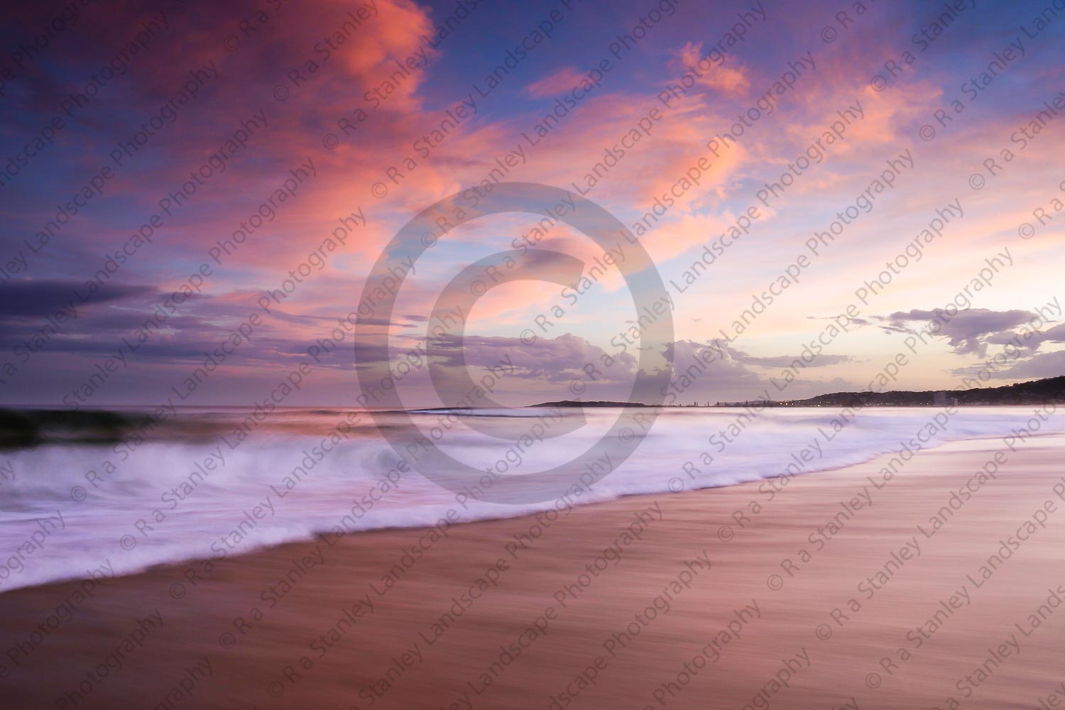 Sunset colours the clouds over North Narrabeen beach. Long Reef Point can been seen off in the distance.