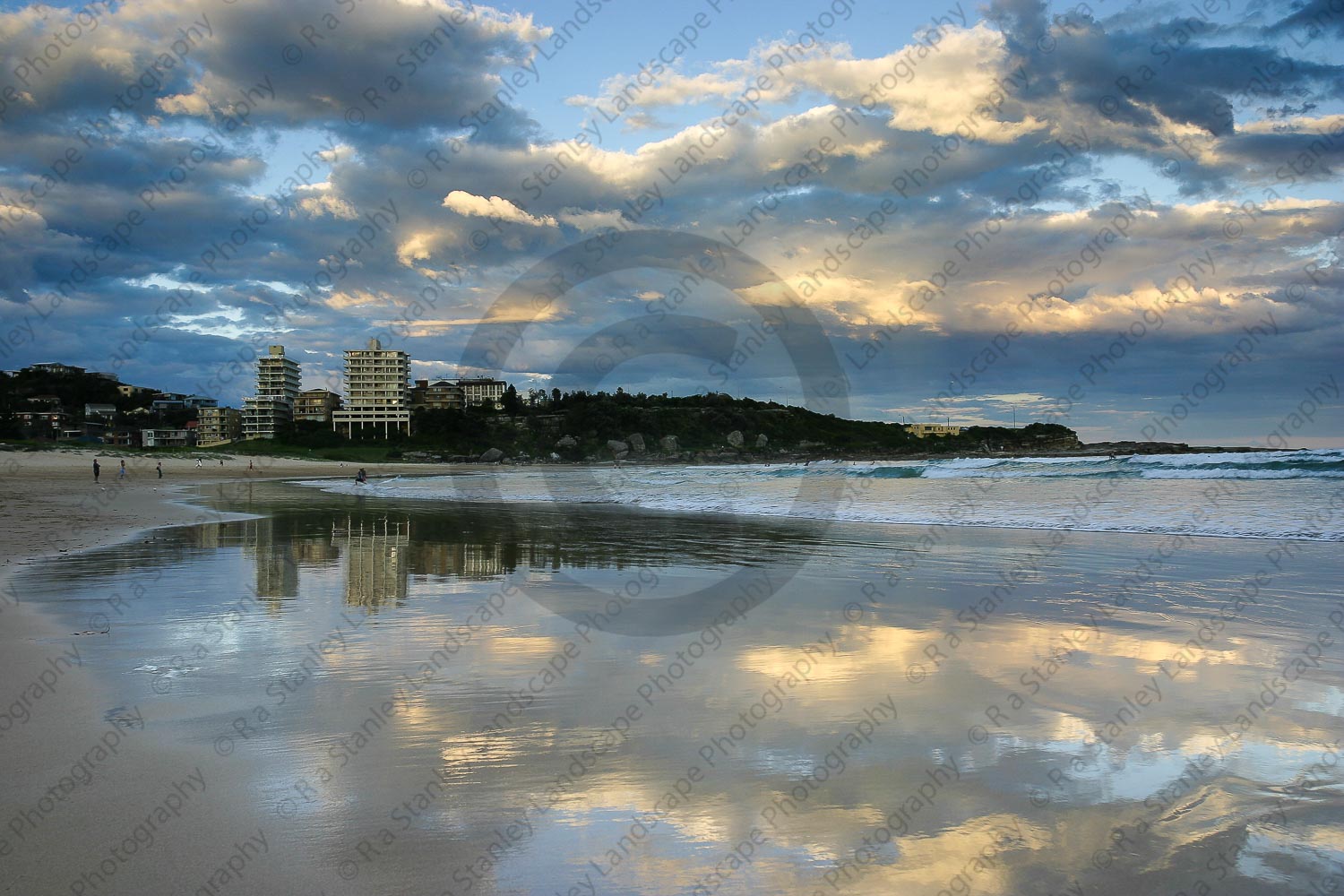Clouds reflect in the wet sand on Freshwater Beach, one of the most popular beaches on Sydney's Northern Beaches.