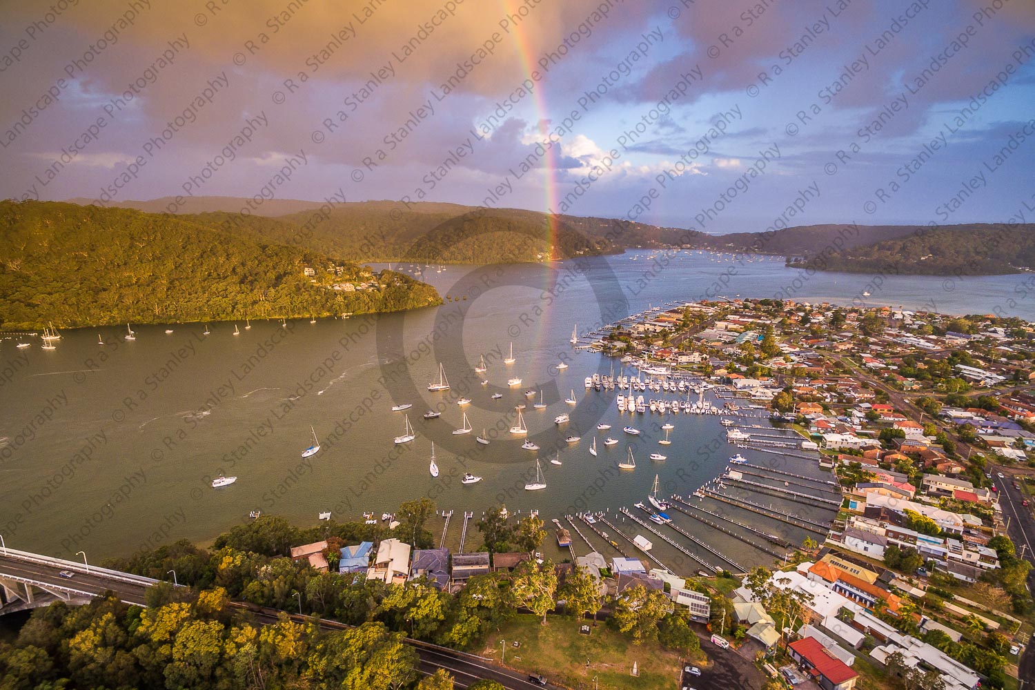 Rainbow over Booker Bay Marina. Booker Bay, Central Coast, New South Wales, Australia