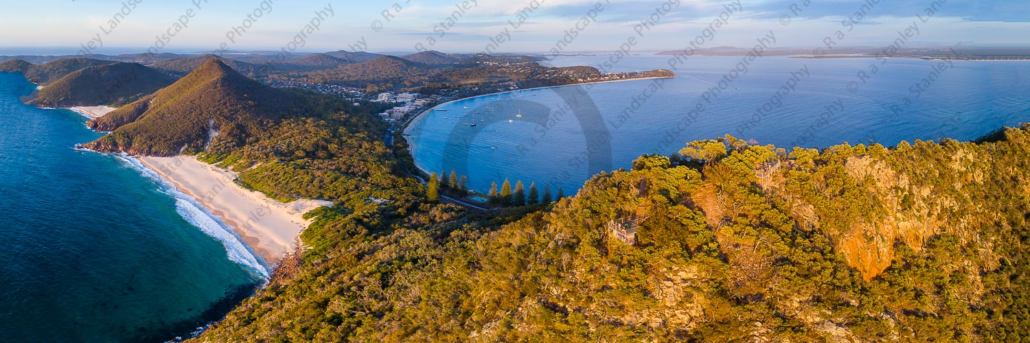 Zenith Beach and Shoal Bay from Mount Tomaree. Port Stephens, Mid North Coast, New South Wales, Australia