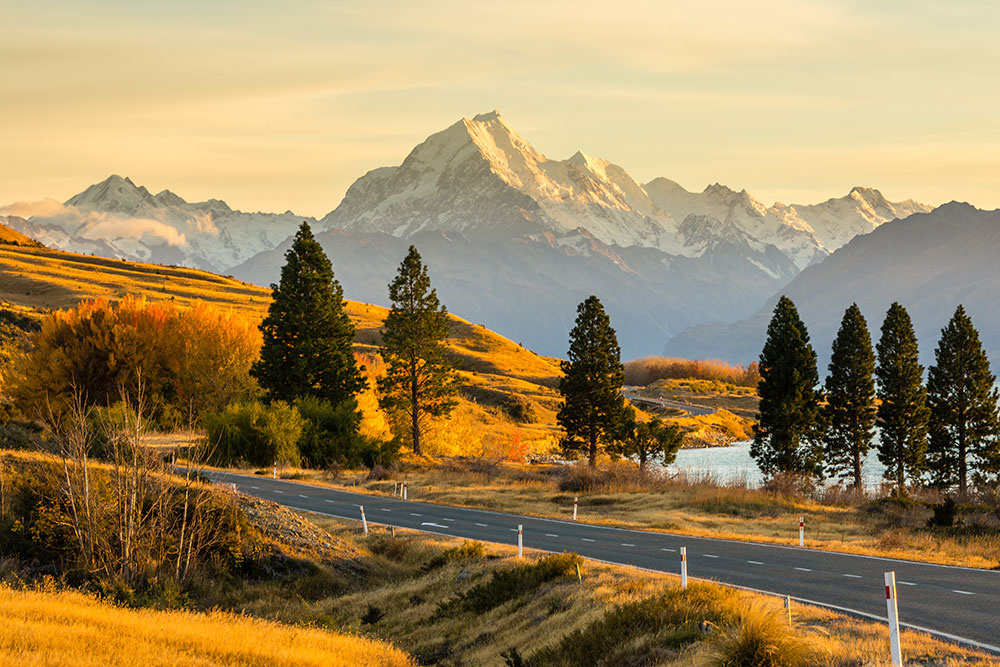 Mount Cook, road and pine trees. Mount Cook, Otago, South Island, New Zealand