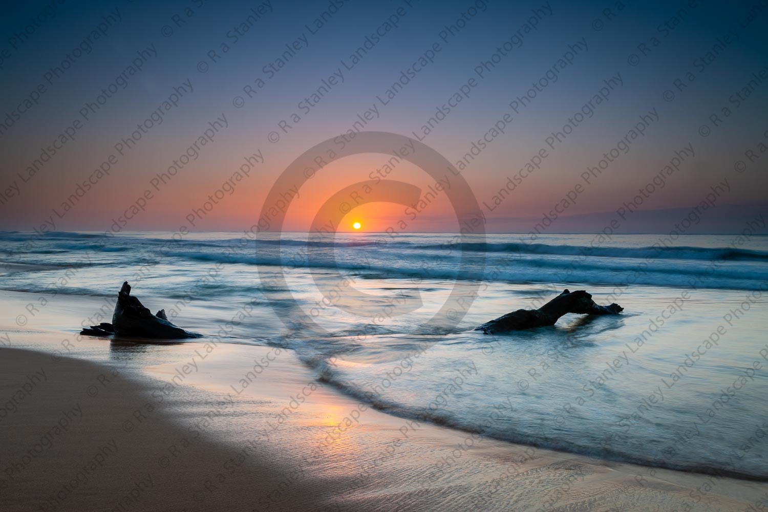 Beached log half submerged with the rising sun. Croajingolong National Park, Gippsland, Victoria, Australia