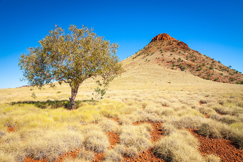 Spinefex grasses and outback rock formations. Millstream Chichester National Park, Pilbara, Western Australia, Australia