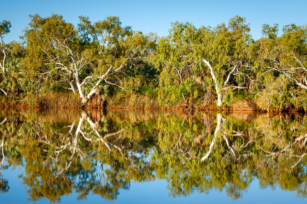 Mirror reflections of gum trees on the Fortesque River at Deep Reach Pool. Millstream Chichester National Park, Pilbara, Western Australia, Australia