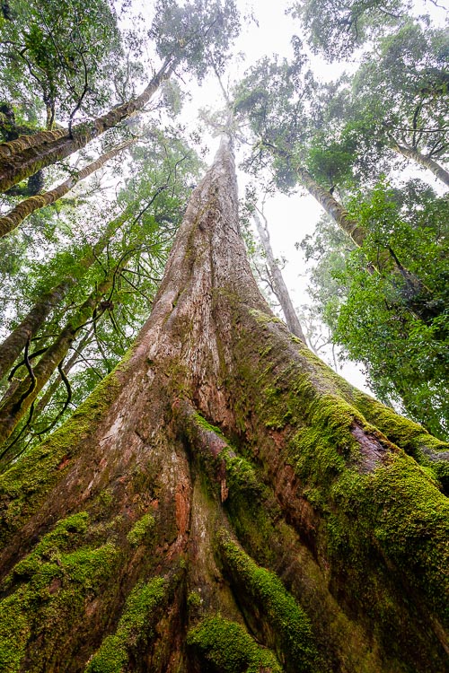 Moss covered buttress roots of large Myrtle Beach tree in Tarkine rainforest. Tarkine, North West, Tasmania, Australia