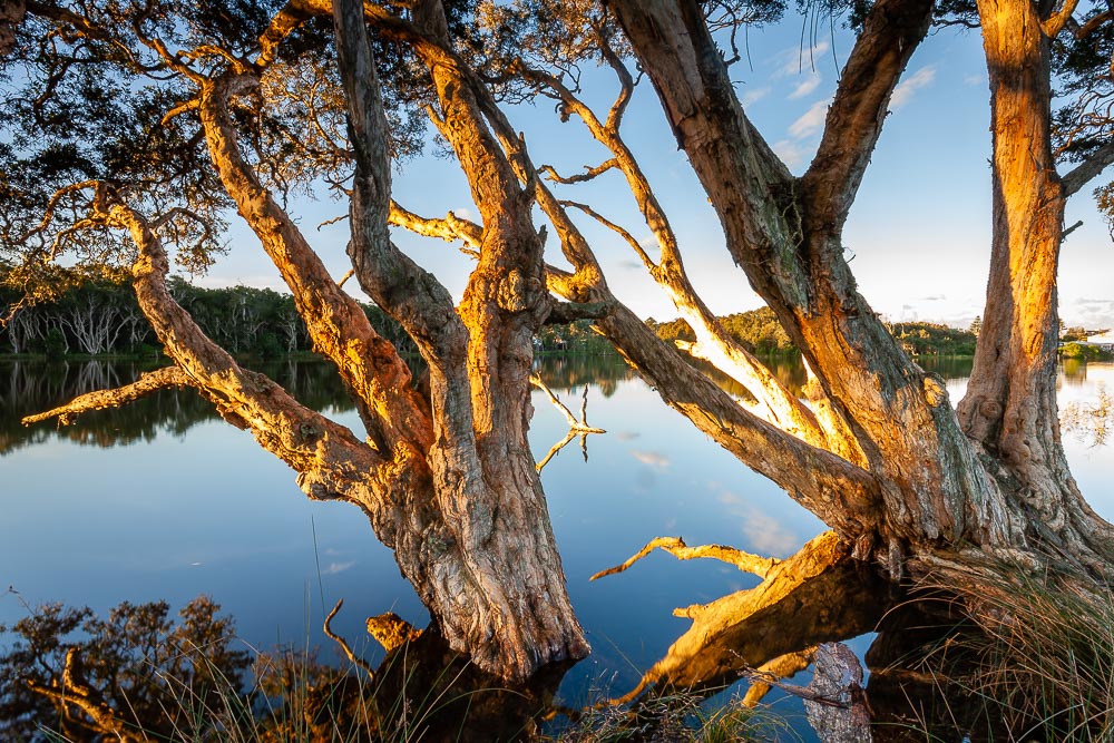 Paperbark trees on the edge of Avoca Lake. Avoca Beach, Central Coast, New South Wales, Australia