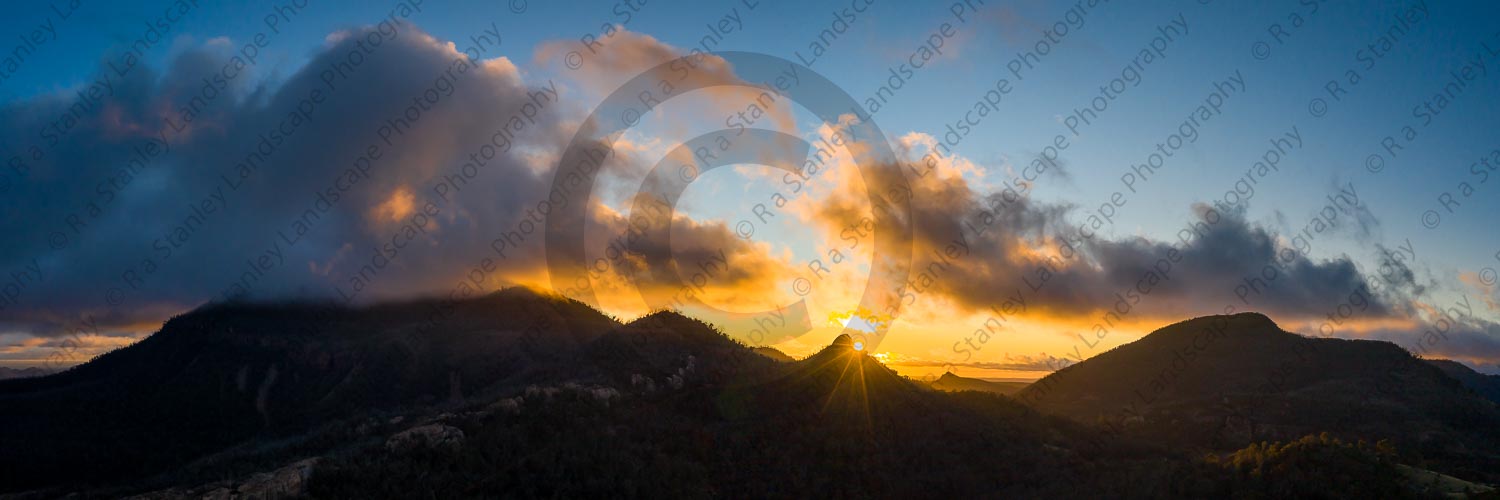 The sun breaks over the ranges of Warrumbungles National Park, Central West, New South Wales, Australia