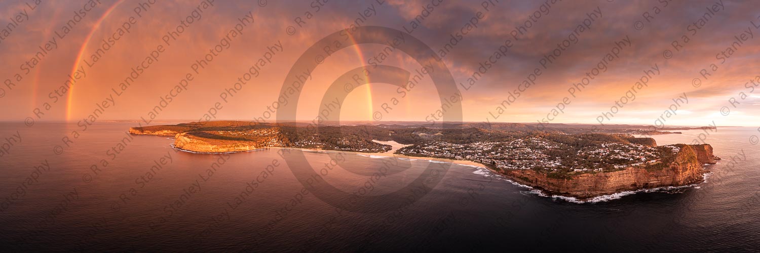 Amazing rainbow forms over second head MacMasters Beach with first head in the foreground. Copacabana Beach, Central Coast, New South Wales, Australia